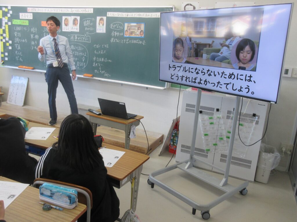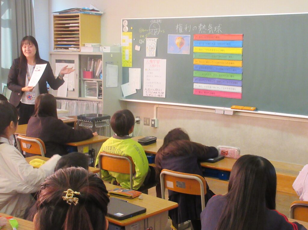 1年生(道徳) テーマ:あなたってどんなひと ねらい:自分の長所を探そう 2年生(学活) テーマ:虫虫教室の席替え ねらい:みんなでなかまづくり 3年生(学活) テーマ:仲間づくり~いろいろな見方・考え方 ねらい:仲間づくりをすすめよう 4年生(道徳) テーマ:けいたい電話の落とし穴 ねらい:情報モラルを考えよう 5年生(学活) テーマ:権利の熱気球 ねらい:考え方の違いを認め合う 6年生(道徳) テーマ:LGBTQ+ ねらい:多様な性について