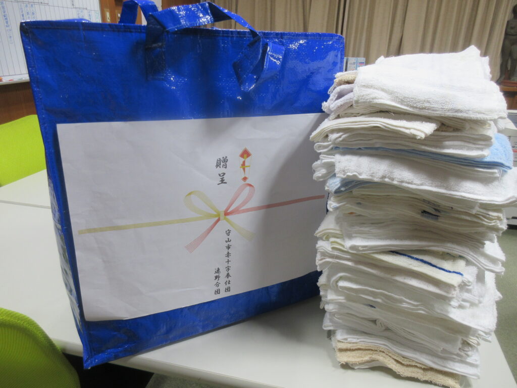 昨日、日赤奉仕団速野支部の今井様、中川様がお越しになり、毎年続けてくださっている雑巾の寄贈を今年もしてくださいました。小学校の現場では、何かと重宝する雑巾を毎年たくさん作って寄贈してくださっています。子どもたちは普段の掃除には自分の雑巾を使っていますが、大掃除の時やいろいろな学習活動や作業等、自分たちの雑巾だけでは対処できない場面で、寄贈いただいた雑巾があると、大助かりです。日赤奉仕団速野支部の皆様、本当にありがとうございます。大切に使わせていただきます。