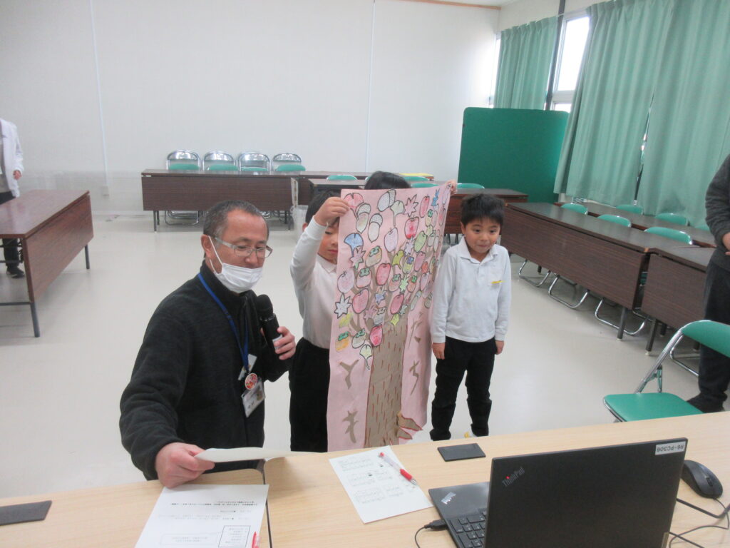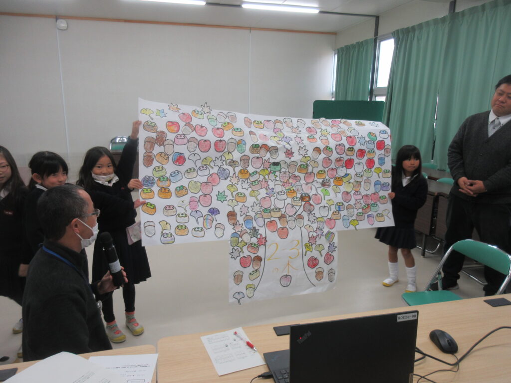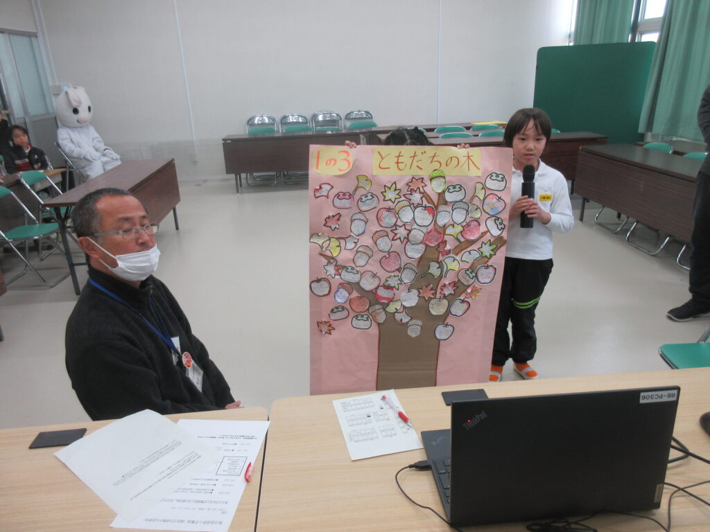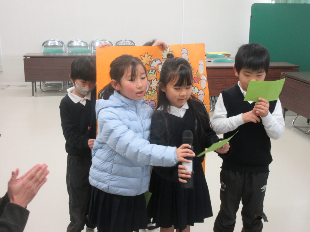 1年生と2年生は、各クラスごとに取り組んだ「ともだちの木」の発表でした。「ともだちの木」とは、クラスの友だちに対して、その人の好きなことやがんばっていることを褒めたり、励ましたり、手伝ってもらったり、助けてもらったりしたことへの感謝の気持ちなどを木の実の形をしたカードに書いて貼り付けていく取組です。どのクラスの「ともだちの木」もたくさんのカードが貼られていました。子どもはよく見ているなあ、優しい見方や捉え方ができるんだなあと感心させられました。