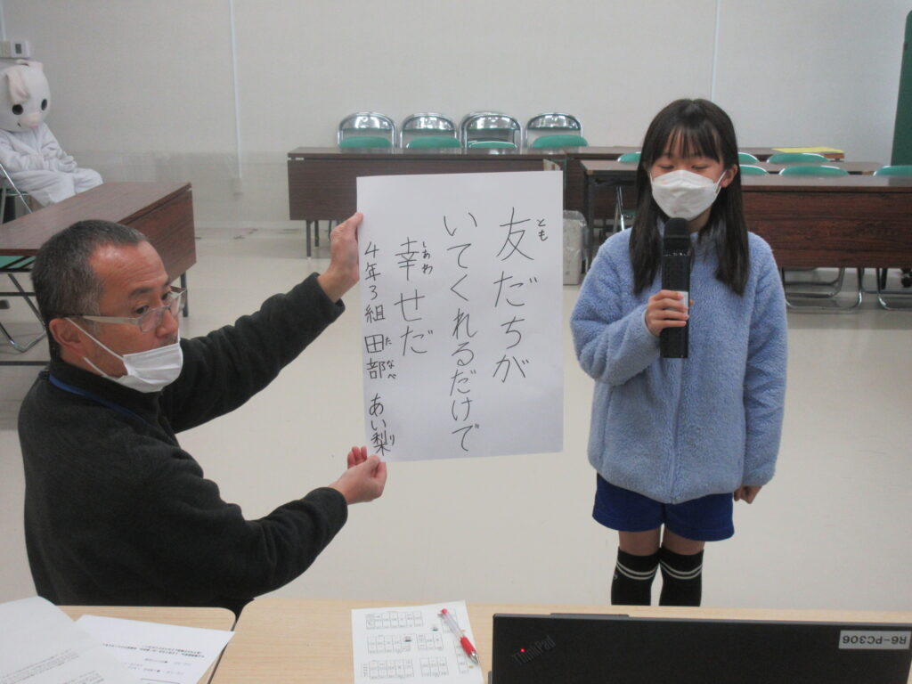 4年生は、人権標語を発表しました。これは大事にしたいなと思ったことや、こんなふうになったらいいなと願ったことを五七五の形式に合わせて、一人一人が考えて作りました。子どもらしい表現の中に、大切なことや素直な気持ち、願いが込められていました。