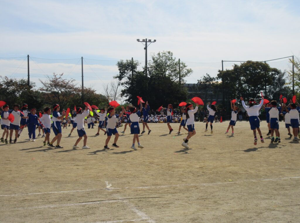 3年生は、トラックを使った全員リレーに初めて取り組む学年なのですが、カーブするコースやバトンパスなど難しい場面でも春のリレー大会の経験をもとにタイム短縮を目指して頑張って走りました。団体演技では、カラフルな扇子を手に、見ている人をハッピーな気分にさせてくれる元気いっぱいのダンスを発表できました。