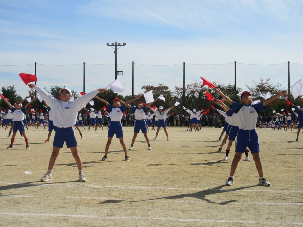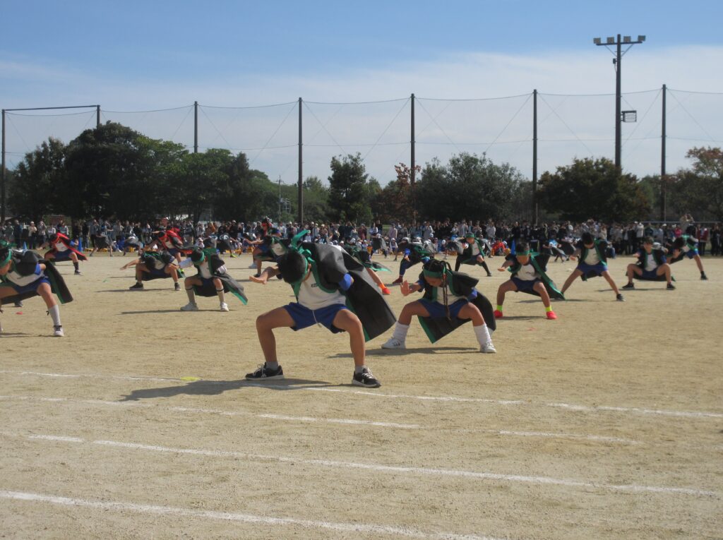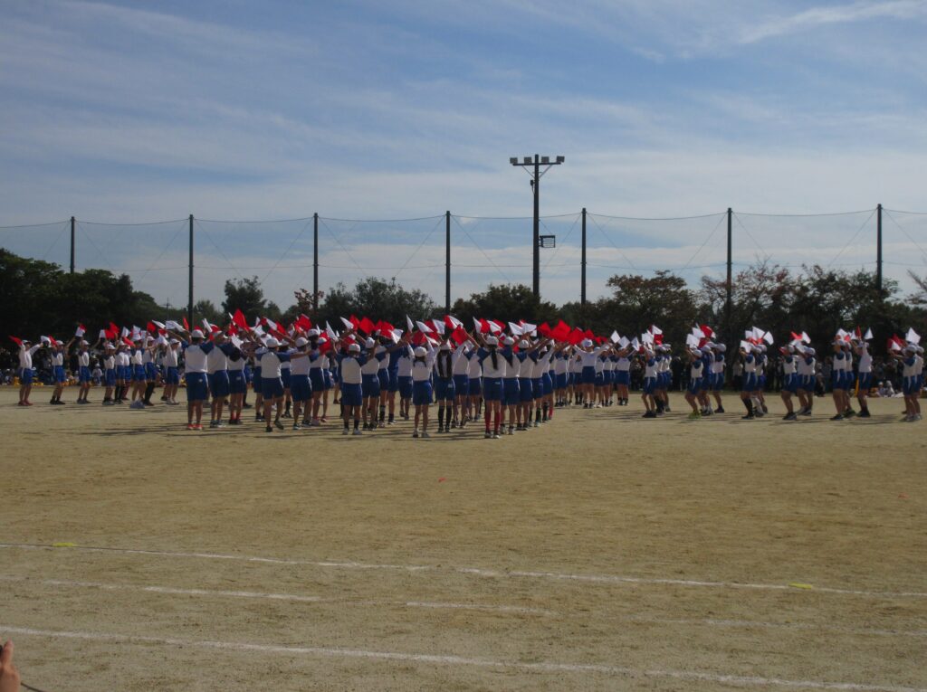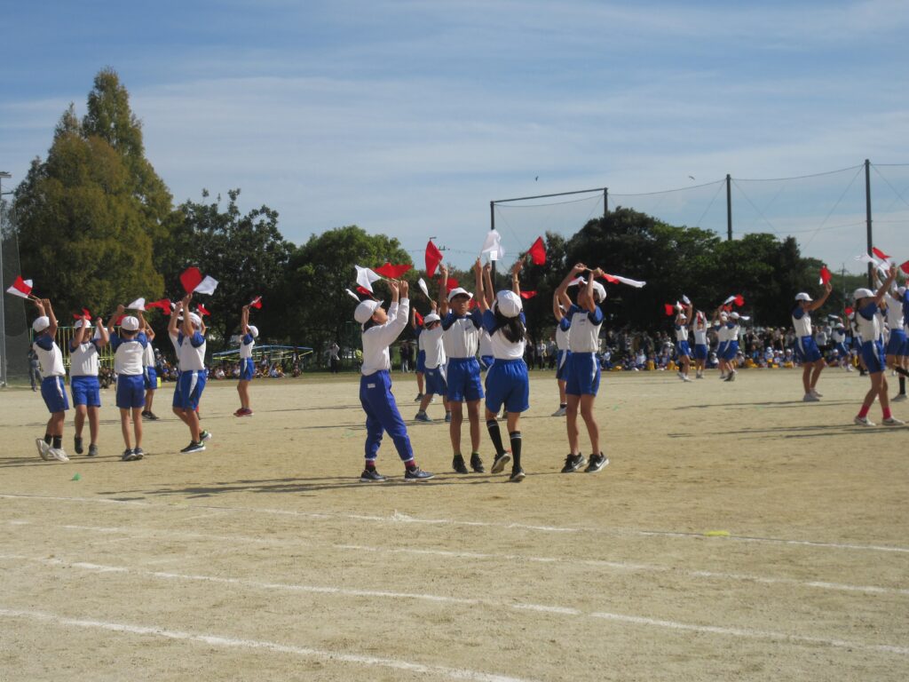 5年生は、全員リレーでは走り方やバトンパスの工夫にそれぞれの持てる力を最大限に発揮して、チームとしてのタイム更新を目指して全力で走ることができました。団体演技では、伝統の旗体操を含んだ表現に取り組み、全員の赤白の小旗がビシッと揃う瞬間や滑らかな隊形移動の美しさがとても見事でした。高学年らしい力強さ、たくましさを感じさせる見事な演技でした。