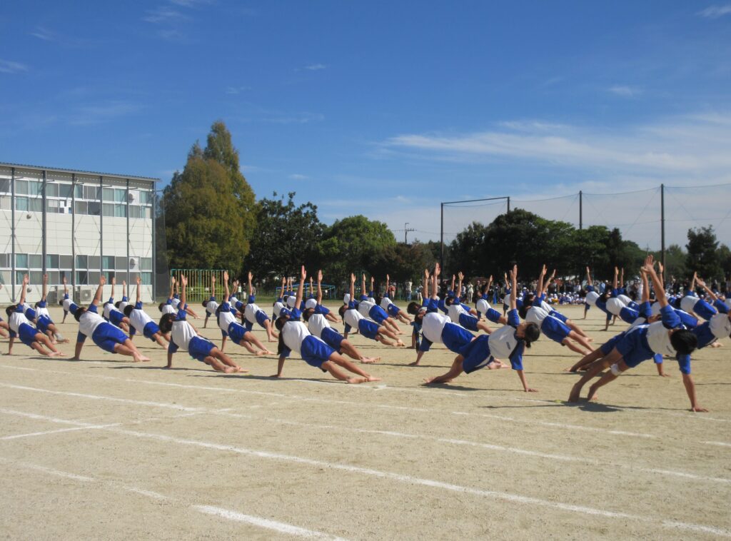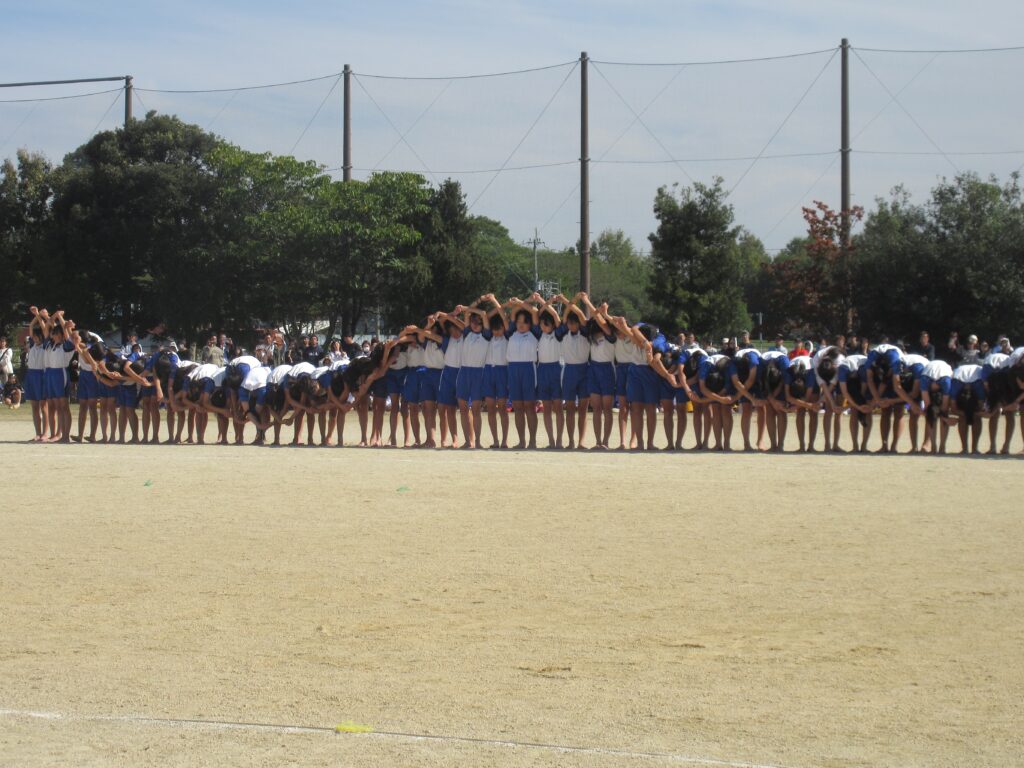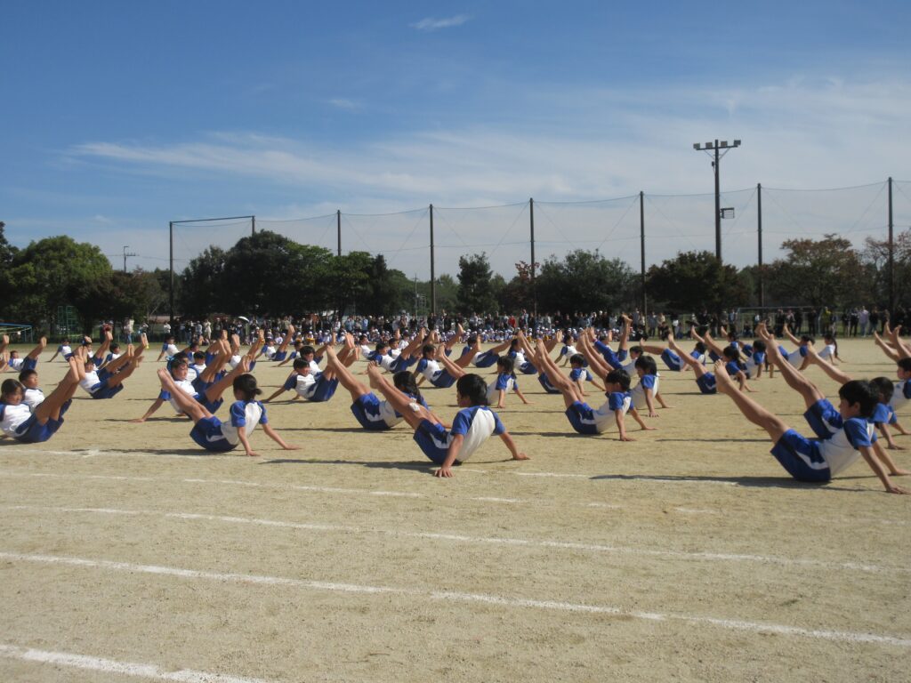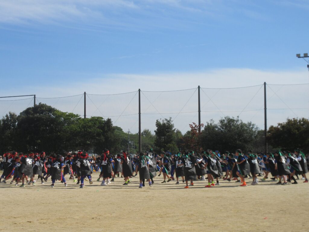 5年生は、全員リレーでは走り方やバトンパスの工夫にそれぞれの持てる力を最大限に発揮して、チームとしてのタイム更新を目指して全力で走ることができました。団体演技では、伝統の旗体操を含んだ表現に取り組み、全員の赤白の小旗がビシッと揃う瞬間や滑らかな隊形移動の美しさがとても見事でした。高学年らしい力強さ、たくましさを感じさせる見事な演技でした。