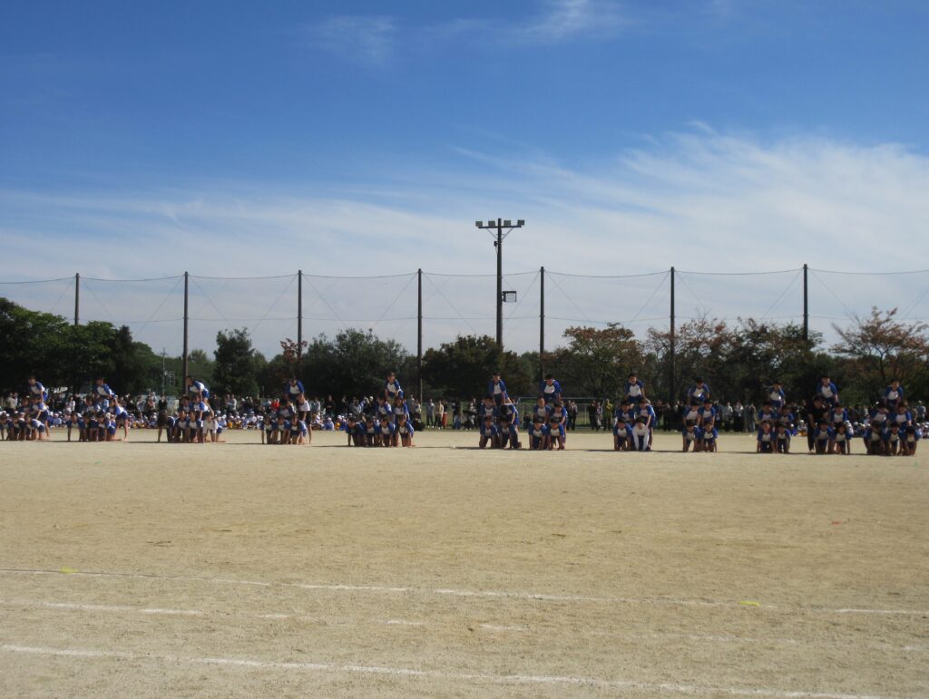 6年生は、3レースに分かれての全員リレー。それぞれのチームで培ってきたスムーズなバトンパスを本番の走りでいかに達成するか、に全力で挑む姿が見られました。そして、運動会の学年最終プログラムである組体操。全力の基本姿勢の凛々しさ、全員が揃える個人技の静止度など一人ひとりの表現も素晴らしいものでした。少人数の組み合わせ技からピラミッドへと進むにつれて、緊張感も高まっていきました。最後、6年生全員が運動場の中央に横一列に並び、波を表現したときには、大きな拍手が会場から湧き起こりました。退場する際、子どもたちのすべての演技をやり切った清々しい表情がとても印象的でした。
