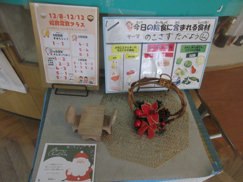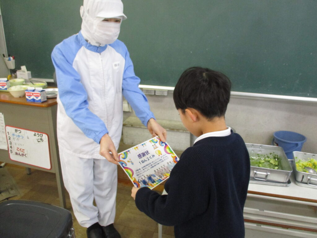 今日で2学期の給食が終わりました。先日はクリスマスメニューということで、手作りのカップケーキもつきました。最終日の献立は、子どもたちの大好きなカレー。ご飯が空っぽになるくらいの大盛況でした。自分にできる範囲で無理なく残食を減らすことに全校で取り組んでいますが、2学期完食が多かったクラスに、その頑張りを称えて給食調理員さんと栄養教諭の谷口先生から、感謝状が贈られました。まだ暑さが厳しかった9月から、雪が降りそうなくらい寒くなった12月までの長い2学期の間、毎日安全でおいしい給食を用意してくださった給食調理員の皆様、本当にありがとうございました。