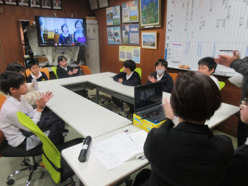 続いて、各学年代表の「冬休みの思い出」「3学期のめあて」に関するインタビューがありました。それぞれに、冬休みの出来事や3学期に頑張りたいことを答える様子が各教室に伝わり、始まりの日にふさわしい発表になりました