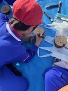 開校式の後は、「やまのこ」学習の先生方とともに公園内の森を散策し、落ち葉や木の実など自然の中にある“お宝”を探しました。また、のこぎりを使った丸太切りにも挑戦し、貴重な体験をすることができました。