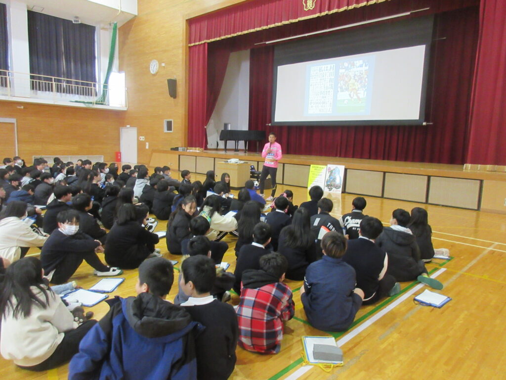 当日は、前半は講演で、「人生はいい方向にしか進まない」「夢はかなうもの」「夢は人をつなぐ」などの“村田語録”が連発され、そのポジティブな発想、その裏にある真摯な思い、そして諦めない心について熱く語ってくださいました。また、「夢ノート」の具体例も提示していただきました。後半は、特製コーナーでストリートサッカー対決をしていただき、大いに盛り上がりました。最後は大じゃんけん大会まで用意してくださり、学校にサインボールも寄贈してくださいました。終了後もサインをねだる子どもたちに、最後の1人まで丁寧に向き合ってくださっていました。村田様、この度は本当にありがとうございました。